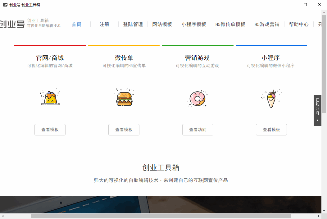 创业号创业工具箱是一款可以帮助创业者轻松创建微信小程序和网站营销运营的管理平台,该平台的功能强大,能够帮助用户快速搭建小程序微信商城,优化网站,提升顾客的转换率等;软件的使用方式比较简单,海量的网站搭建模板,不花几天时间就可以快速搭建一个精美的网站;对于创业者而言,一个精美的官方网站可以让用户更具安全感,对品牌的认知感也更加强烈;但是很多创业者在创业初期,碍于资金匮乏,不能寻找团队制作高大上的企业网站,因此大部分创业者选择将网站搭建的事项一拖再拖;有了这款创业号创业工具箱,创业者将不再受到资金和时间的困扰,及时布局线上平台。