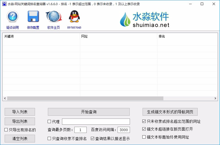 水淼网站关键词排名查询器是一款非常简单且实用的网站关键词排名查询工具,如果您需要查询网址的百度收录和关键词排名,就可以使用到这款软件,从整体来看,软件的操作还是很简单的,只需导入网址和关键词,设置相应的查询选项,一键即可进行查询,通过相关精准的查询算法快速且准确的显示查询结果,包括关键词、网址和排名,便于您直接了解网站的百度收录情况以及网站关键词排名情况,支持将查询结果以描述进行显示,总之这是一款非常好用的软件,如果您有需要,那就赶快下载体验一下吧!