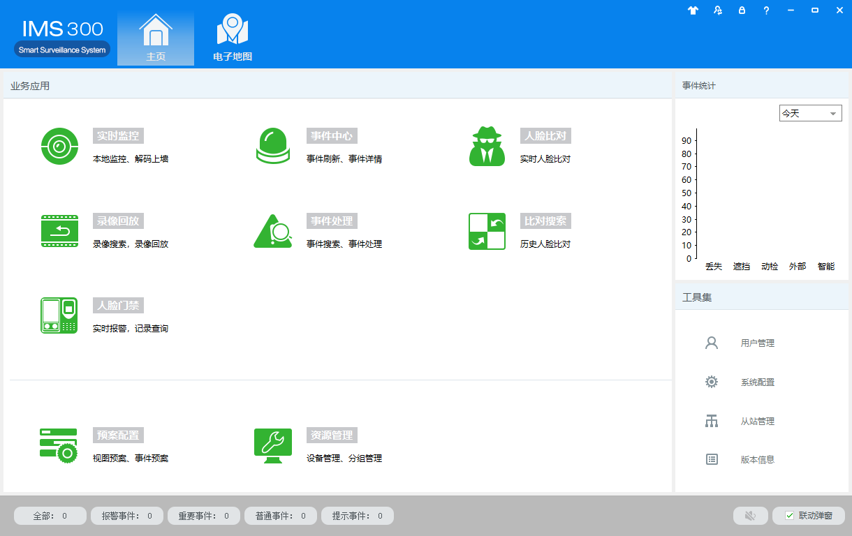 IMS300是杭州智诺科技有限公司最新研发并推出的视频监控软件,该软件内置有实时监控、事件中心、人脸比对、录像回放、事件处理、比对搜索、人脸门禁等多种功能,可以对本地进行视频监控、解码上墙,可以监控时间进行刷新、详情查看,可以对实时监控人员人脸对比等操作;通过该软件用户可以对监控视频进行录像回放,录像搜索和管理,方便用户对监控事件进行便捷处理,可以查看历史人脸对比信息,查询并处理报警事件记录等信息,帮助用户高效便捷的完成安防监控视频事件处理工作,可以说是一款非常强大专业的视频监控软件。