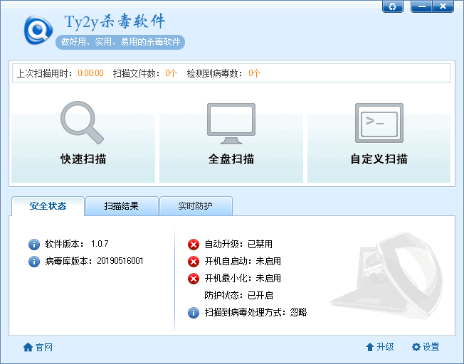 Ty2y杀毒软件是一款开源的免费病毒防杀工具,该工具拥有简洁的用户界面,使用方式简单,能够扫描计算机中的各种病毒文件并进行清理,这款软件还拥有强大的病毒防护功能,可以有效抑制病毒文件的启动,避免计算机受到病毒的危害;软件主要还是依靠手动扫描来查杀计算机病毒,它支持三种常规的扫描方式,用户可以根据个人的情况来选择适合的方式扫描计算机;Ty2y杀毒软件作为一款轻量级的杀毒工具,在为计算机提供安全防护功能的同时也降低了计算机的内存压力,需要的朋友欢迎下载。