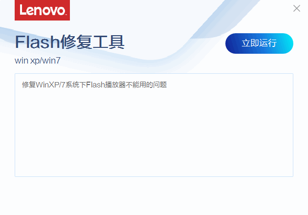 联想flash修复工具是一款flsh播放器修复软件,它可以帮助用户自动检测系统的flsh播放器,并对有异常的播放器进行修复,让用户能够在网页中正常播放视频;软件由联想官方认证,在安全性上大可放心;该软件仅支持win7以下的系统,对于win 8以上的系统是不支持恢复的,这款工具的使用方式非常简单,轻轻一键,破损的播放器就可以被修复;虽然联想flash修复工具的功能似乎比较简洁,但是它的体积小巧,即开即用,不用安装,这为减少了用户计算机的内存使用。