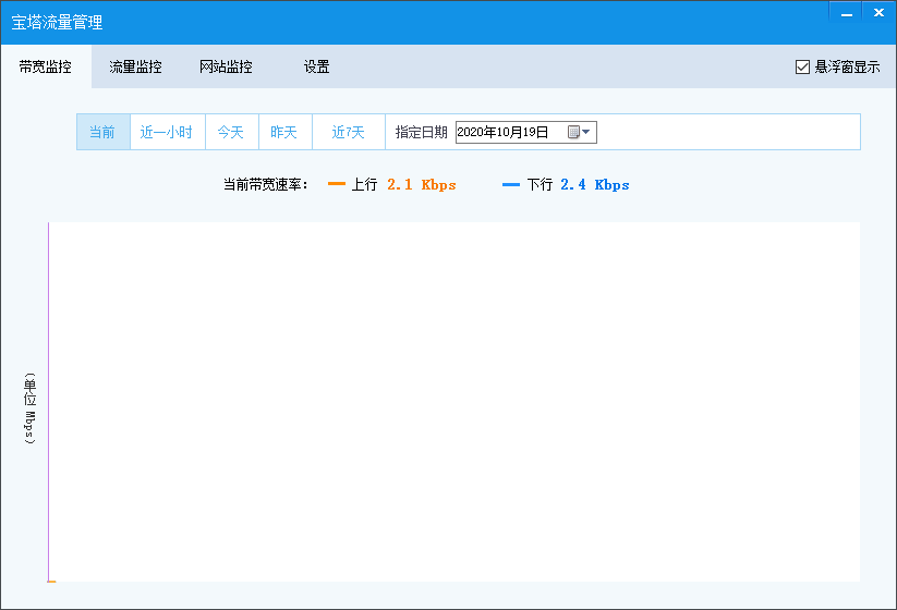 宝塔流量管理工具是一款网速检测管理软件,它能够将电脑的流量数据使用情况记录下来,并通过图表的方式展示给用户,用户可以直观的查看到具体某一天的数据使用情况,是一个很好的服务器流量监控工具;软件的使用方式简单,功能比较单一,除了检测流量的使用和网速状况外,它还支持网站监控功能,透过该功能,用户可以及时的获取网站中发布的最新信息;宝塔流量管理工具为用户提供流量检测功能,当网速出现异常的时候,用户通过它可以对网络进行判断修复。