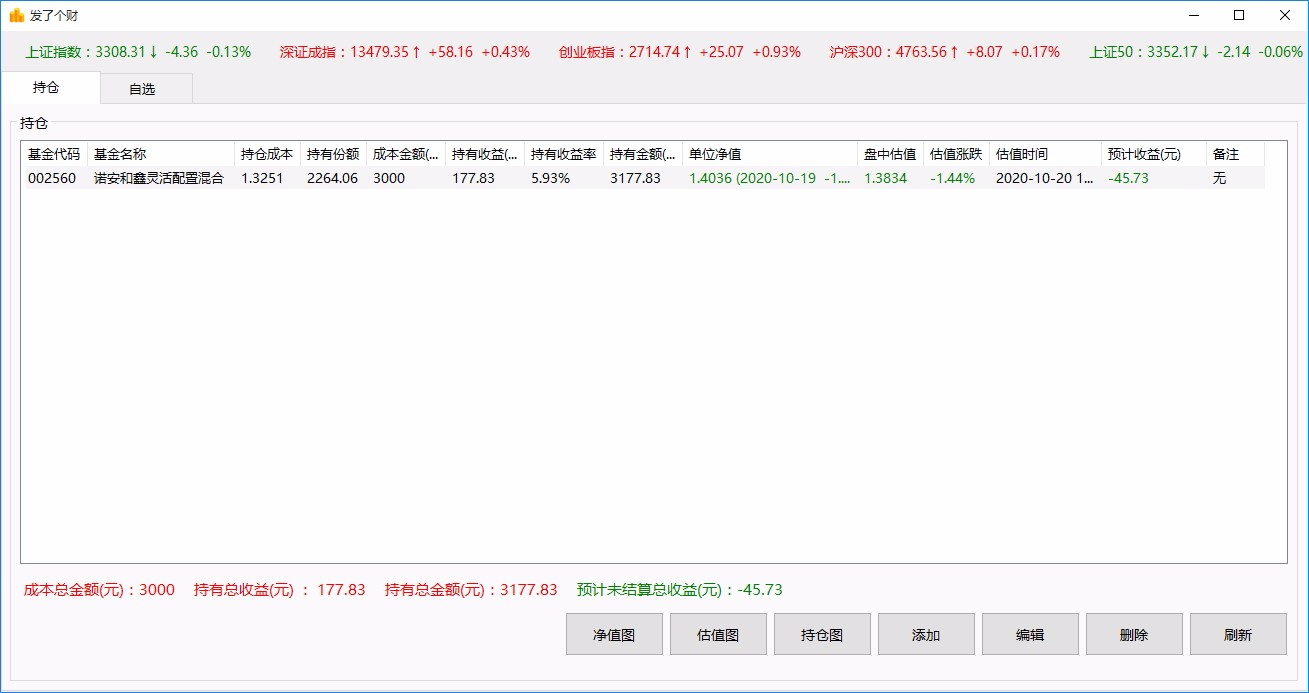 发了个财是一款非常专业且优秀的基金估值获取软件,用VB.NET进行编写,体积虽然小巧,但是功能却很强大,具备简洁直观的操作界面,您可直接在软件界面查看基金的相关信息,一目了然,分为持仓和自选,可查看不同类型的基金信息,包括基金代码、基金名称、持仓成本、持有份额等,可计算预计收益,根据您的买入情况快速且准确的进行计算,除此之外,支持查看基金的净值图、估值图和持仓图,总而言之,这是一款非常好用的软件,如果您有需要,那就赶快下载体验一下吧!