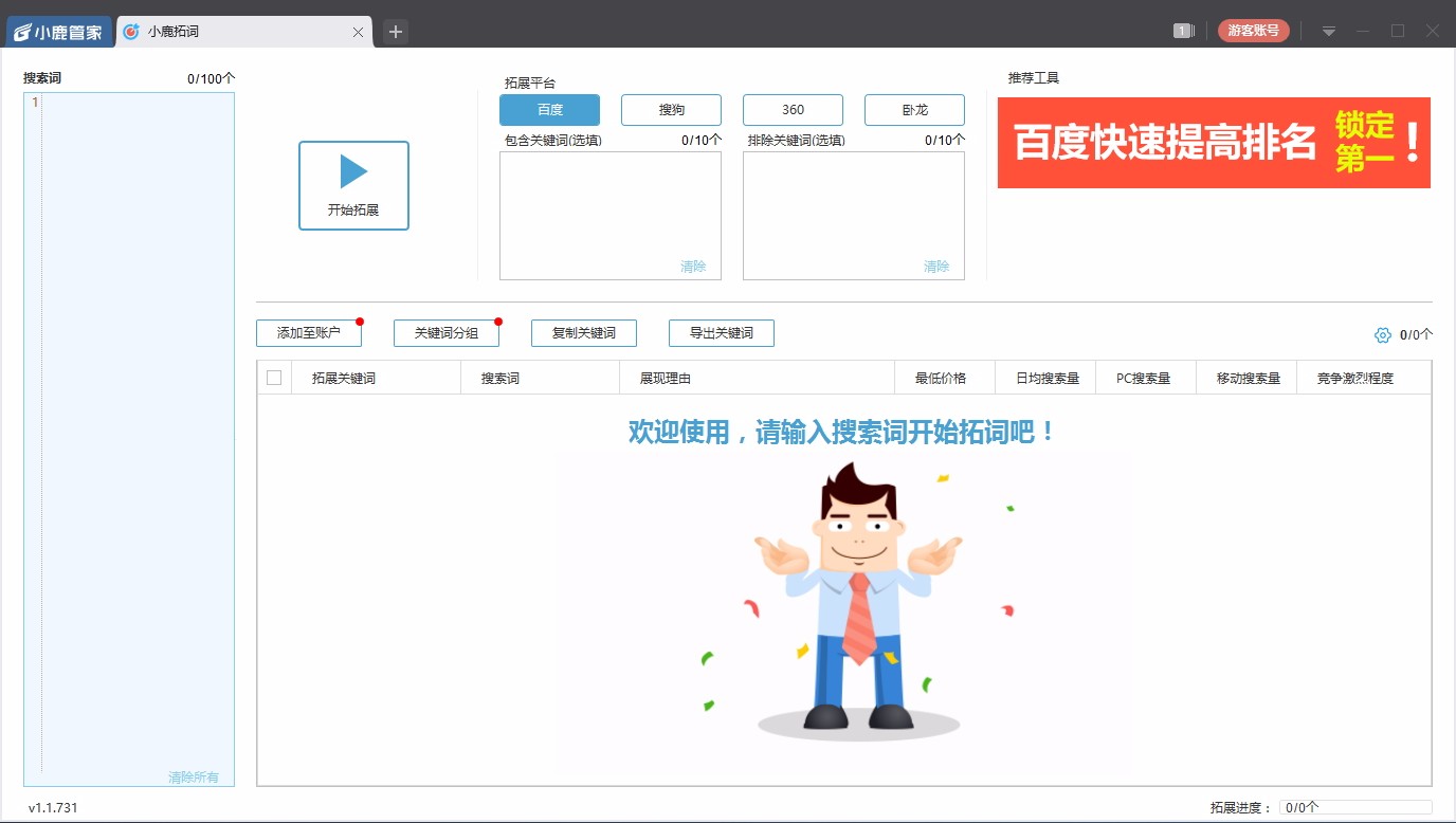 小鹿拓词工具是一款非常专业且优秀的拓词工具,通过这款软件可以帮助用户拓展关键词和长尾词,便于用户推广,如果您需要更多的高质量关键词,就可以用到这款软件,软件可根据用户投放的关键词,以此来拓展更多好的关键词,支持批量拓展,使用起来非常方便,您可输入搜索词,选择好相应的拓展平台后,一键即可开始拓展,按照所输入的搜索词快速且高效的显示出对应的拓展结果,给出了展现理由,还可查看最低价格、日均搜索量、PC搜索量和移动搜索量,以此确定竞争激烈程度,通常情况下,竞争越激烈的关键词,质量越好,这么好用的软件,赶快下载试试吧!