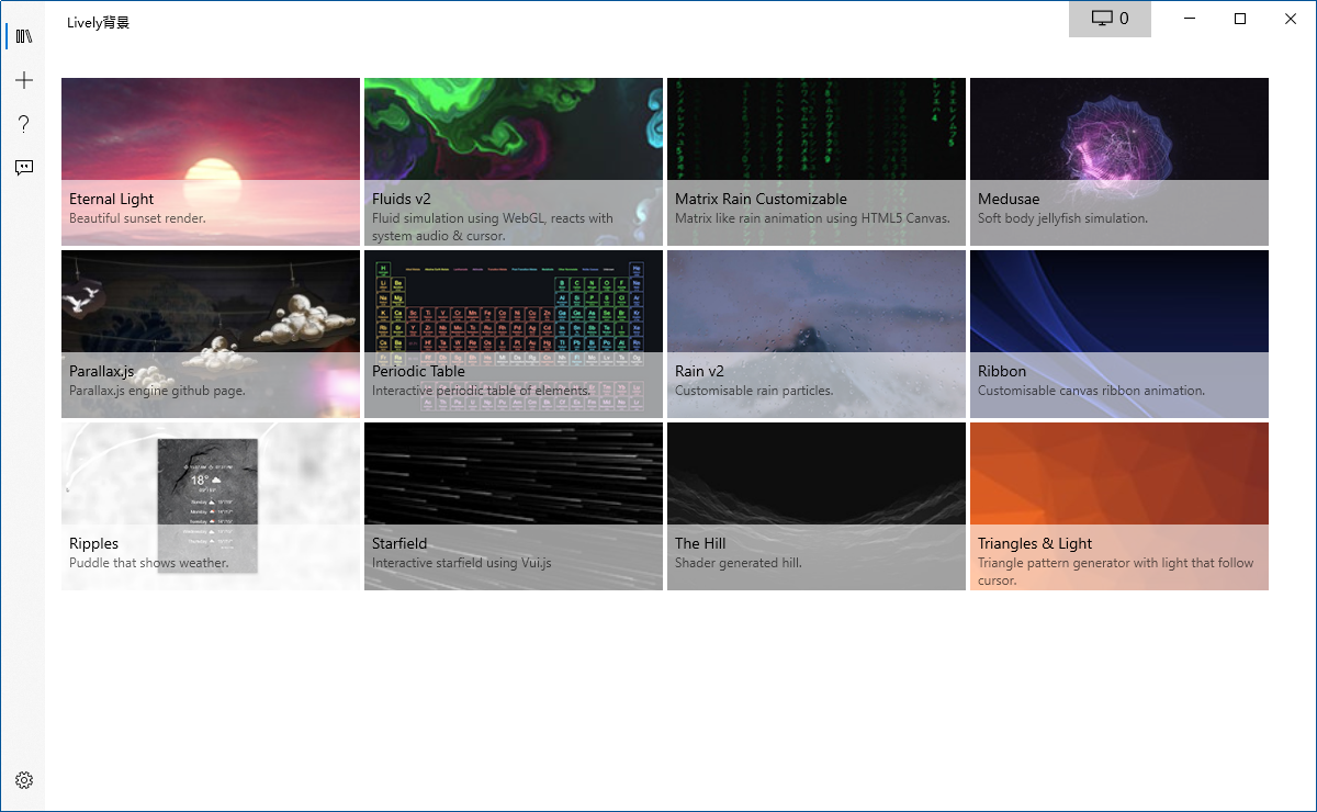 Lively Wallpaper是一款专业的动态壁纸软件,该软件专业实用、操作简单,内置有多种动态壁纸资源,用户可以免费点击进行使用,通过该软件用户可以直接将本地的视频或者GIF图片添加到软件上,让后将其直接设置为桌面动态壁纸;对于需要动态桌面壁纸主题或者看够静态壁纸的用户可以下载Lively Wallpaper这款动态壁纸软件,该软件支持更多下载动态壁纸下载,可以保存多种动态资源,可以帮助用户美化系统桌面,让用户可以面对炫酷多彩的动态桌面主题,不满足静态图片背景的用户可以下载试试看。