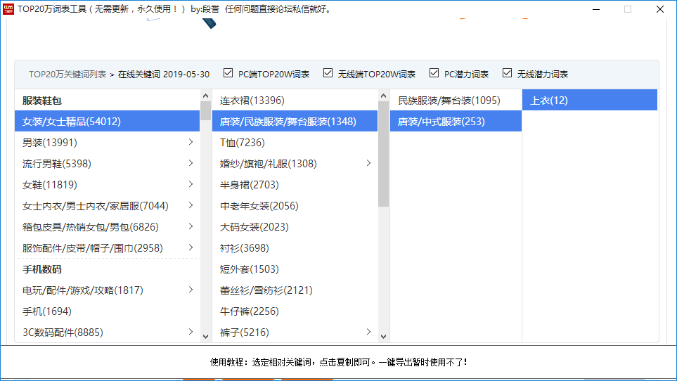 TOP20万词表工具是一款免费的电商关键词查询工具,该工具收集了近两年来各种商品分类的关键词信息,用户可以在软件中查找相关的关键词并复制使用;该软件属于查询型的工具,本身也没有太多可设置的地方,因此使用比较简单;软件支持用户按照商品分类查询关键词,也支持使用相关的关键词进行搜索,还支持用户筛选相关的关键词列表进行一键复制;TOP20万词表工具不需要注册登录和更新,直接启动后就可以使用,感兴趣的小伙伴欢迎下载体验。