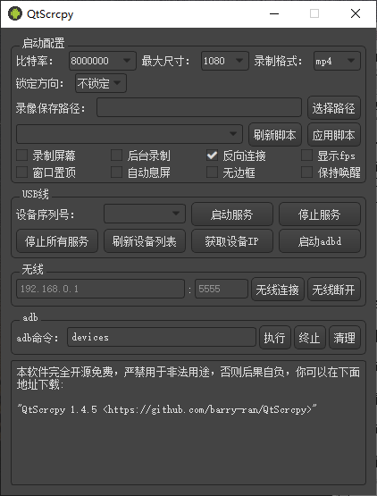 QtScrcpy是一款体积轻量、简单实用的安卓手机控制软件,该软件可以支持有线连接和无线连接两种方式,支持Linux、Windows和Mac平台进行使用,软件可以通过USB数据线进行有线设备进行连接,最多可同时连接16个安卓设备;QtScrcpy这款手机控制软件,也可通过输入IP地址进行无线配置连接,无线使用USB数据线也可对手机进行操作,通过该软件用户可以对手机设备的录像功能进行,可以设置录像保存路径、录制视频格式、视频录制相关功能进行编辑,可对其设备进行专业的手机控制,非常简单实用。