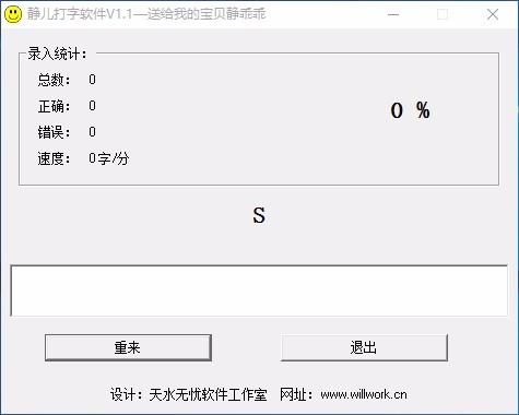 静儿打字软件是一款非常简单且实用的打字学习软件,是网友专门为自己的女儿制作的软件,软件体积小巧,所占内存也小,使用也很简单且方便,非常适合小朋友使用,通过这款软件,可让您的孩子学习打字,学习使用键盘,更早的接触到电脑,提升自己的打字速度,以及英文字母的录入速度,您只需要输入软件提示的英文字母,录入指定的英文字母后,可自动显示录入统计,包括总数、正确数、错误数以及速度,可随时查看打字的准确率,这么好用的软件,赶快下载试试吧!