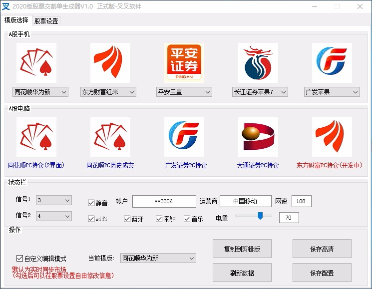 股票交割器是一款非常专业且优秀的股票交割软件,专为喜欢炒股的股民设计开发,可帮助股民进行选股交易以及股票交割,可在电脑上显示手机页面,并可选择手机页面的模板,支持多种不同类型的股票,包括同花顺、大通证券、东方财富等,除此之外,还可设置电脑页面模板,支持自定义编辑模式,可对多个选项进行自定义设置,可查看不同交易平台的股票数据以及更新交易截图,值得一提的是,可对股票进行设置,包括证券名称、股票代码、盈亏等信息,这么好用的软件,赶快下载试试吧!