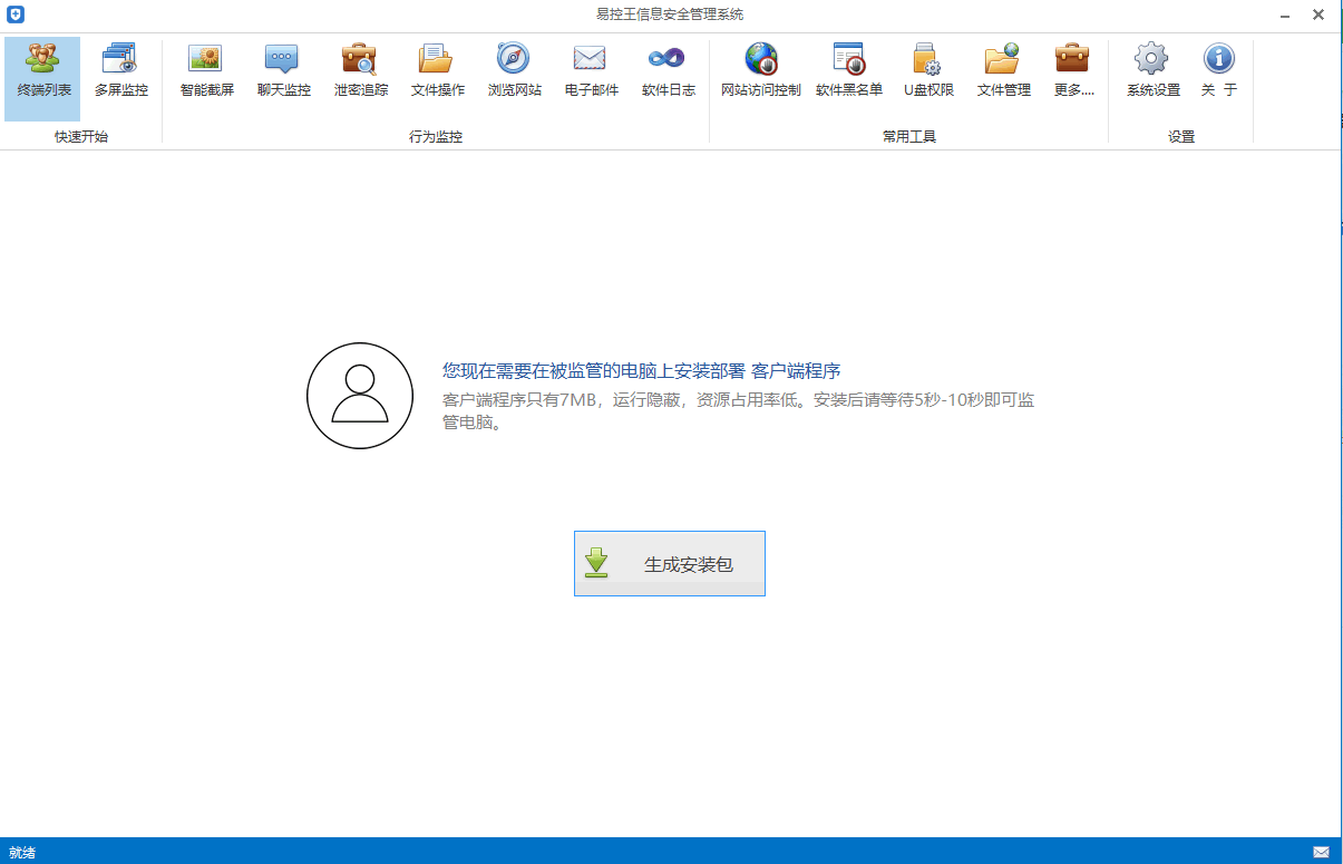 4、打开软件之后,点击软件主界面中间的按钮生成被监控端的安装包,然后将其安装在被监控端的电脑中。