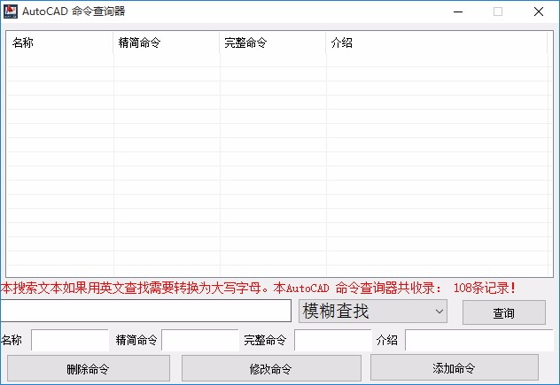 AutoCAD命令查询器是一款非常简单且实用的AutoCAD命令查询软件,可帮助用户快速对AutoCAD命令进行查询,当您在使用AutoCAD软件进行绘制时,如果能够快速查询到相应的命令,并可快速进行了解,即可更好的进行绘制,使用起来非常方便,也可有效提高绘制效率,小编特地推荐这款软件,支持查询精简命令,也可查询完整命令,如果您需要用英文查找时,则需要将其转换为大写字母,查询完成后,可查看查询的命令对应的名称和介绍,支持修改命令和添加命令,欢迎有需要的用户下载体验
