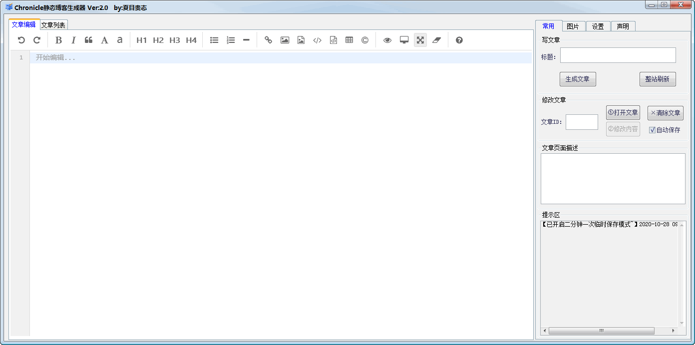 Chronicle静态博客生成器是一款可以用于编辑网页或者文章的编辑工具,这款软件的使用方式简单,拥有一个直观简洁的工作界面,实现真正的所见即所得;软件拥有自动保存功能,当软件因为意外退出或者在未保存的情况下退出后,用户在下一次开启软件的时候,软件会提示用户是否恢复到之前未完成编辑的文章中; Chronicle静态博客生成器可以进行文章排版和网页优化,让用户轻松编辑适合在博客显示的文章;软件会自动为文章添加网页属性,因此当前的文章排版发送到网页中之后依旧不会改变。