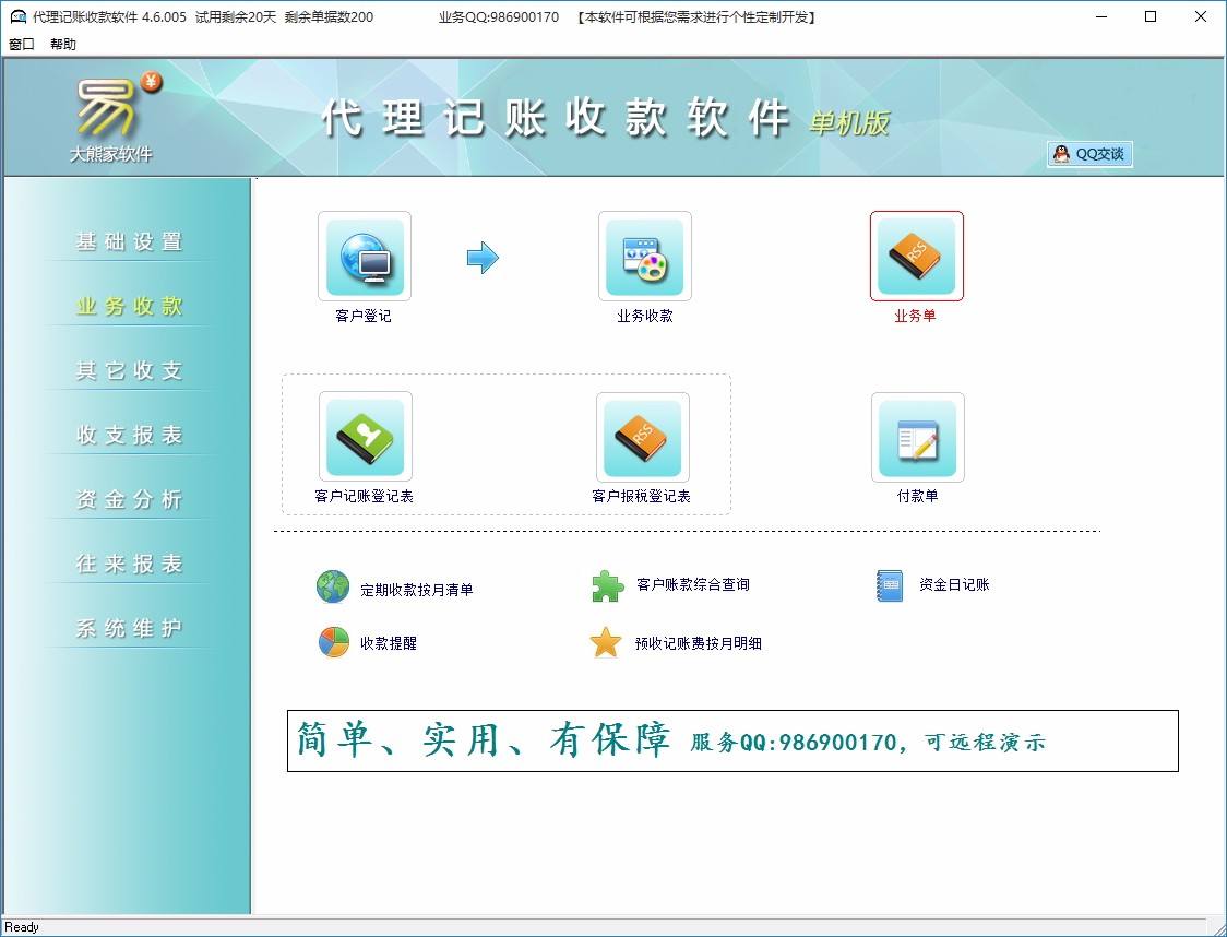 11、业务收款,可选择客户登记、业务收款、业务单等