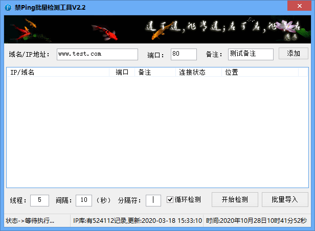 禁ping批量检测工具是一款简单易用的网络PIN值检测工具,该工具采用C++编写,体积小巧,不会占用过多的计算机内存资源;在使用电脑上网的时候,有些网站的服务器是禁用网络ping的,为了让用户可以直观的检测网络状态,今天为大家推荐这款简单小巧的网络检测工具;这款工具的使用方式简单,直接使用网络IP和端口就可以创建网络测试项目;同时这款工具还非常高效,您可以将所有需要测试的服务器地址和端口保存到Excel中,然后通过软件快批量导入进行网路检测。