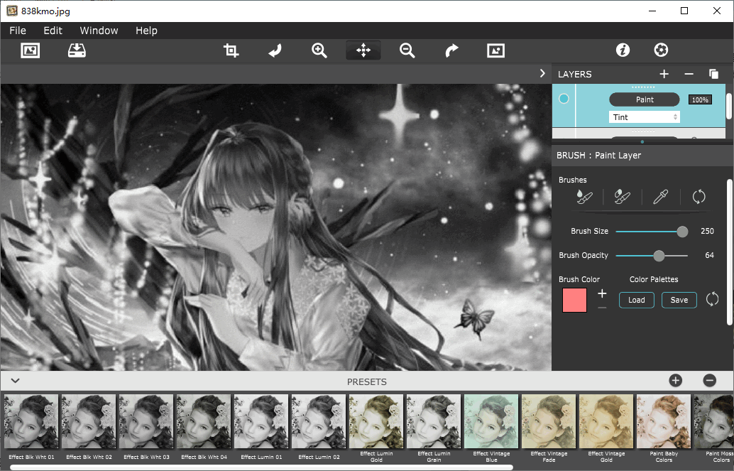 2、3种图层样式-“着色图层”允许刷回原始颜色,“绘画图层”允许使用画笔和调色板自定义颜色,“自动绘画图层”允许删除原始颜色,以及名为“背景效果”的基础层可以更改照片效果样式飞行中,而无需更改其上方的手工着色层,这使您无需重新绘制图像即可发挥创意。