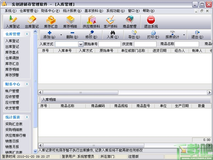实创进销存管理软件主要包含功能:入库登记、出库登记、库存盘点、仓库调拨、库存汇总、库存明细、库存预警、帐户管理、应收管理、应付管理、收支管理等。