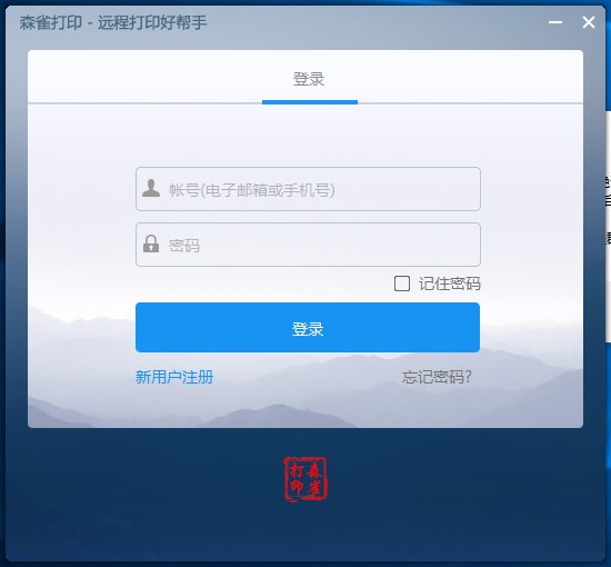 2、主机端A=接打印机的电脑,客户机端B=使用共享打印机的电脑,A和B都需要注册不同的帐号并登录,目前注册不一定要用真实邮箱,比如可以编一组数字加上@senque.com也是可以的,但是注意不要加一些英文符号,比如一符号等。口令用于以后取回密码。注册完并登录,进入软件界面。