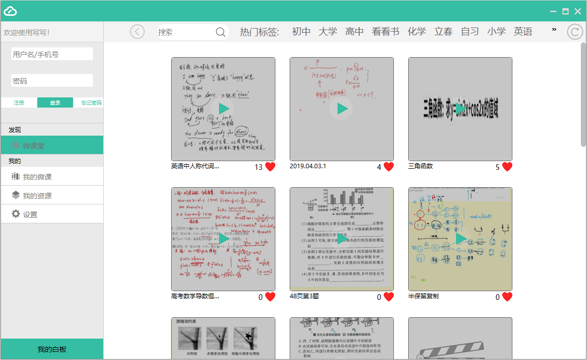 写写微课是一款简单易用的微课制作工具,该工具使用方式简单便捷,支持用户录制白板课程和观看相关课程视频;软件可以轻松导入多种常用文档,并且可以扫描手写文本到软件上;线上教育的发展让不少从事教育的用户在闲暇时间,开始学习制作在线课程以与他人分享;该工具支持任何经验的用户制作微课,可以满足一般用户的使用需求,同时它还提供了丰富的课程共享,用户可以通过关键字和便签等搜素方式来查找您需要的课程进行观看;需要的朋友欢迎下载