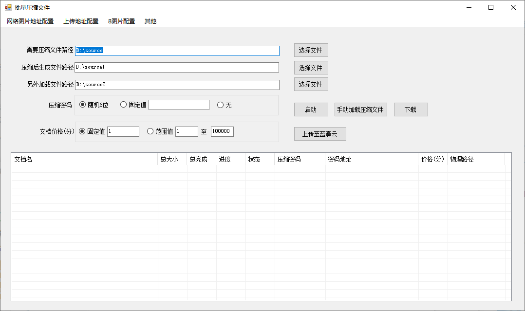 批量压缩文件工具是一个由网友分享的批量文件压缩工具,用户可以使用它进行一般的文件压缩,也可以直接将文件压缩后上传到云盘中,通过云盘分享加密文件,赚取一定的收益;软件使用方式比较简单,您可以提前配置好云盘的上传地址,完成文件压缩之后一键就可以直接上传;批量压缩文件工具还是比较实用的,软件允许用户自定义文件的加密密码,并且自动生成一个密码图片,如其他用户需要解压该文件,就需要支付一定的金钱,然后才能获取文件的解压密码。