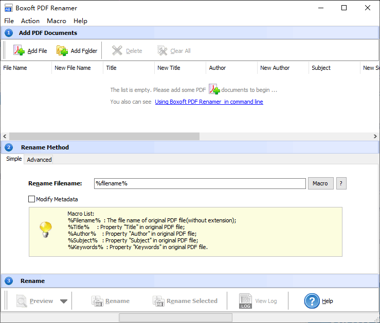 Boxoft PDF Renamer可以使用PDF文件的元数据来更改PDF文件名,包括标题,作者,主题,关键字,创建者,生产者甚至文件大小。