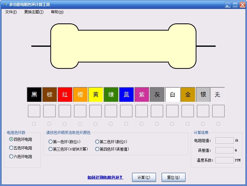 多功能电阻色环计算工具是一款非常简单且实用的电阻色环计算软件,提供简单的计算功能,可帮助用户快速将电阻色环进行计算,如果您需要计算电阻色环,就可以用到这款软件,提供电阻图形,以及多种不同的颜色可供选择,支持不同色环数的电阻,每选择一个色环颜色,电阻图形上都会显示出指定色环对应的颜色,可查看按照色环顺序每个色环的颜色,便于检查是否选择错误,方便修改,选择好颜色后,一键即可进行计算,快速且准确的显示出计算结果,欢迎有需要的用户下载体验