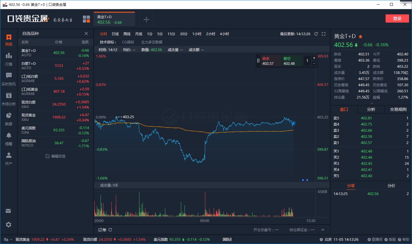 可查看贵金属的当前价、涨跌额、涨跌幅等信息