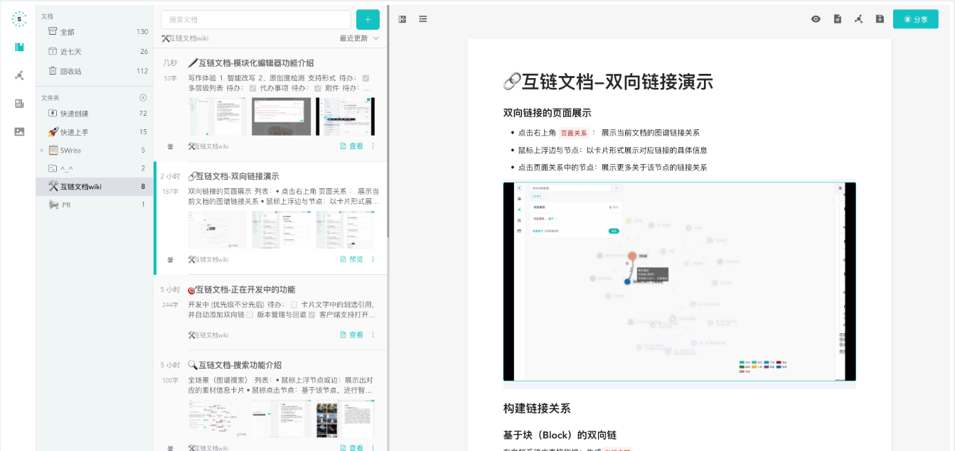 Swrite互链文档是一款结合目前现金的全网知识图谱而设计的双向链接笔记软件,该软件可以帮助用户创建和编辑双向链接的笔记导图文档,让用户可以用链接创造新世界、扩展新思路,可帮助用户理清所有复杂思绪、解决诸多疑难事务,是一款简单易用的多功能互链文档编辑软件;Swrite互链文档支持笔记记录、文章润色、文档管理等多种功能,让用户可以自由进行文档编辑,可以自由修改文本内容,同时该软件还支持强大的搜索功能,可以搜索和推荐相关关键词的内容咨询、短句、图片等资源,方便用户进行借鉴采用,是一款非常不错的文档编辑软件。