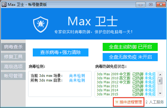3、登录之后手动开启安全防御,现在软件就可以开始保护您的3Dmax了。