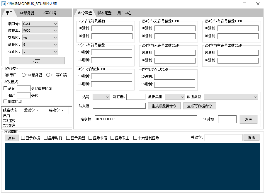 伊迪派MODBUS_RTU测控大师是一款功能强大、简单易用的开发物联网、工控设备、仪器仪表的RTU通讯协议调试软件,该软件绿色安全、体积轻量,无需安装下载即用,支持串口、TCP服务端、TCP客户端等通讯方式,用户只需输入远程IP和远程端口即可打开进行使用,是一款非常简单好用多功能通讯调试工具;伊迪派MODBUS_RTU测控大师支持的脚本模式创建、删除、修改等功能,可以自由进行脚本配置,可以模拟上位机进行modbus协议主机的使用,让用户可以实现数据24小时采集,是一款非常强大使用的MODBUS_RTU测控、串口调试软件。