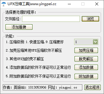 英培UPX压缩工具是一款实用的程序压缩工具,对于部分不需要安装就可以直接使用的程序来说,体积一般是越小越好,所以对于这部分程序,很多开发者在完成程序开发后都会使用压缩工具将它进行加壳压缩保存;这款UPX压缩工具的功能也是如此,它提供了九个等级的压缩方案,不同的等级压缩效果不一样,压缩的速度也不一样;一级压缩模式压缩的效果比较差,但是压缩的速度却很快,如果您的程序本身就不大,那么就可以使用一级模式进行压缩;除了压缩功能以外,您还可以通过该工具为程序添加数据,附加数据,加壳压缩,添加盾牌和脱壳解压等。