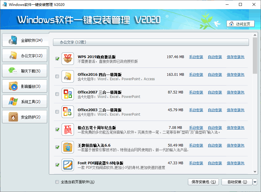 6、您也可以自由的勾选需要安装或者保存的程序,选择完成之后点击右下角的按钮进行保存,安装等操作。