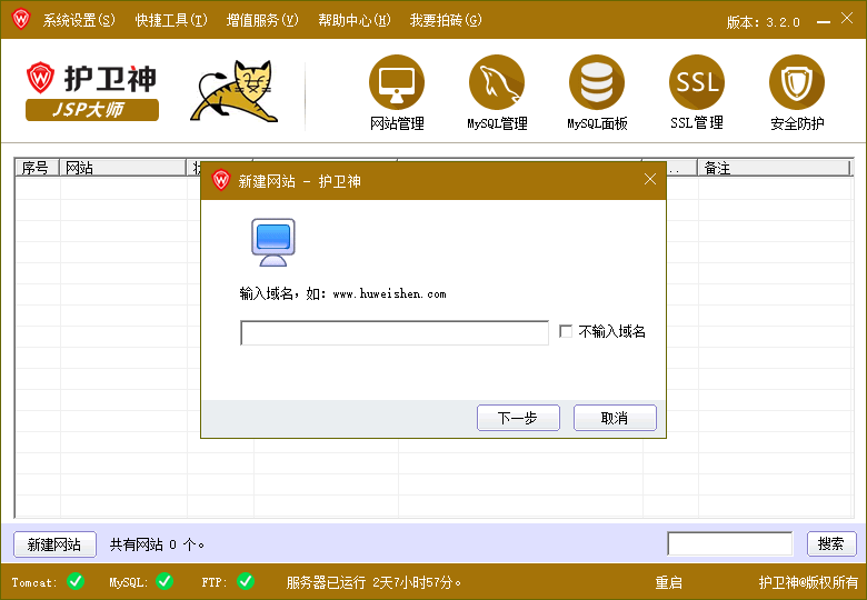 护卫神JSP大师一款实用的建站工具,该工具可以帮助用户一键安装Tomcat+JSP+MySQL+FTP+SQL-Front等,软件自带主机系统,可以直接让用户在电脑上创建网站以及数据库;软件比较稳定,并且拥有不错的兼容性,可以在大部分版本的Windows系统中为用户创建网站;护卫神JSP大师的功能比较丰富,并且使用简单,没有复杂的设置,轻松就可以安装创建网站所需要的环境,同时支持在线多开站点和MySQL安全加固,由此可见这款工具不仅可以创建网站还能保护网站;需要的小伙伴可以下载使用。