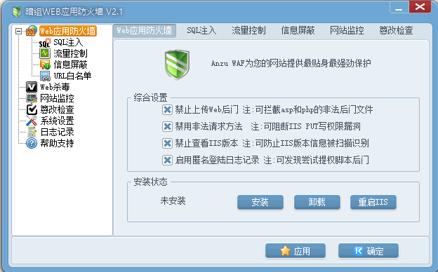 8、 Anzu WA采用正则式匹配技术有效拦截注入威胁,防注入设置,自定义防注入正则表达式内置规则将失效,仅供高级用户使用。