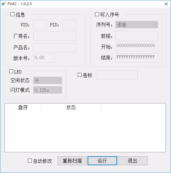 PVAC是一款非常简单且实用的U盘信息修改工具,顾名思义,可帮助用户快速将U盘信息进行修改,我们经常使用U盘保存文件或者一些重要的资料,如果您想对U盘信息进行修改,就可以用到这款软件,具备简洁直观的操作界面,旨在为用户提供一套最简单的U盘信息修改方案,插入U盘后,即可对U盘的VID和PID等信息进行修改,还可通过软件写入U盘的厂商名、产品名等,若U盘信息未显示,可通过快捷按钮,重新进行扫描,总之这是一款非常好用的软件,如果您有需要,那就赶快下载体验一下吧!