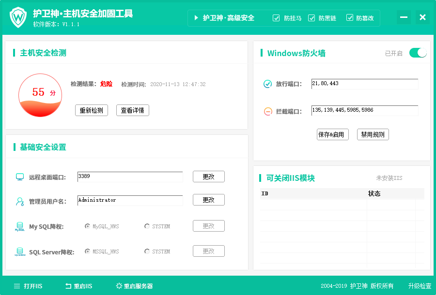【护卫神·高级安全防护】是一套全面防护服务器和网站的安全解决方案,让网站100%防挂马、防黑链、防篡改。包含:入侵防护系统软、网站安全系统、人工安全加固、定制安全策略。