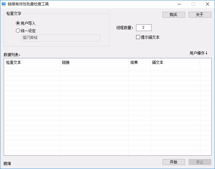 链接信息有效性批量检查工具是一款非常简单且实用的链接信息有效性检查软件,通过这款软件,可帮助用户快速对链接信息的有效性进行检查,查看是否为有效的链接信息,便于站长更好的对网站进行管理,具备简洁直观的操作界面,旨在为用户提供一套最简单的链接信息有效性检查方案,只需几个简单的步骤一键即可开始检查,快速且准确的显示出检查结果,可查看每个检查文本对应的结果,支持批量检查,这样一来您就不用一个一个进行检查了,使用起来非常方便,欢迎有需要的用户下载体验