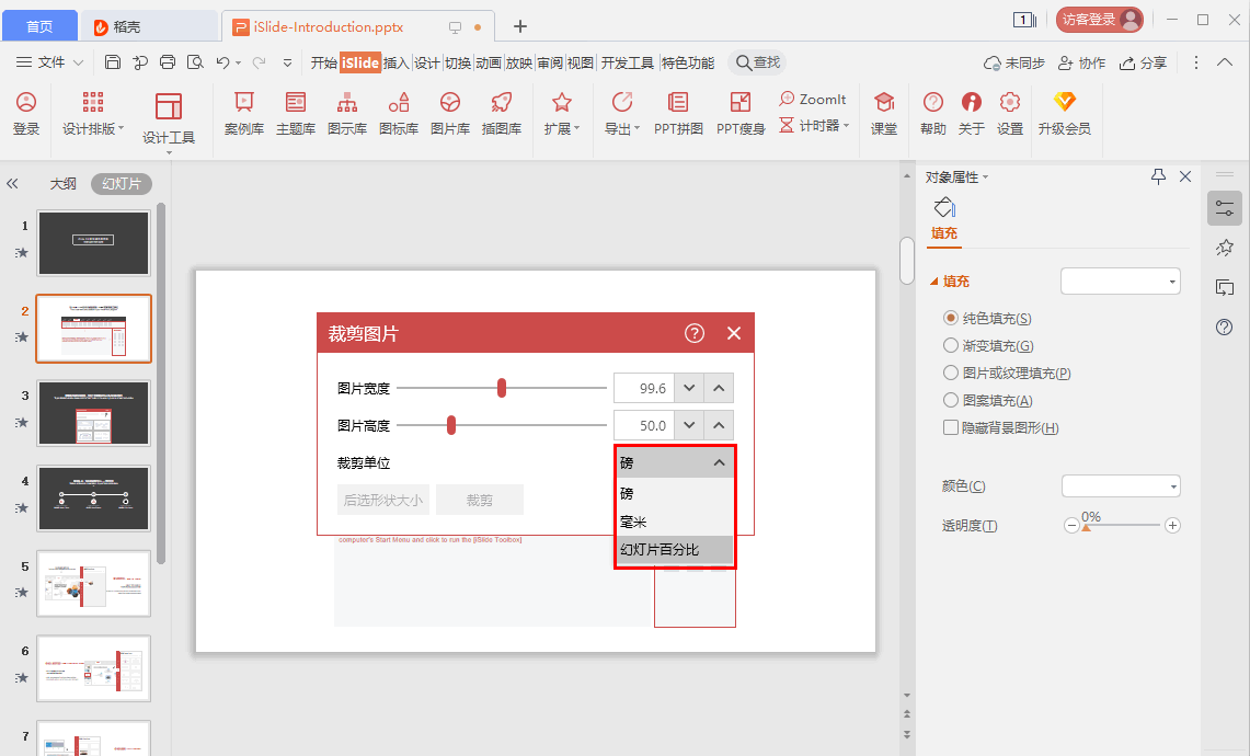 7、然后设置裁剪的单位,可以是磅,毫米和根据幻灯片百分比进行裁剪。