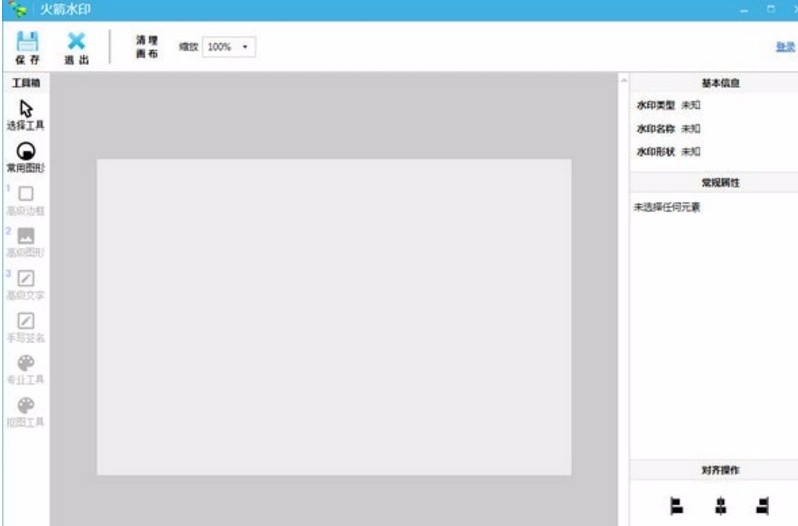 火箭水印官方客户端界面干净简洁、简单实用,内置有工具箱、选择工具、常用图形、高级边框、高级图形、高级文字、手写签名、专业工具、抠图工具等多种功能,点击即可进行使用,可以帮助用户轻松便捷的进行图片水印编辑设置,让用户可以得到满意的图片水印;火箭水印编辑工具是一款免费制作水印印章的强大软件,通过该软件用户可以制作个人印章、部门印章或其他特色印章等,该软件内置有多重常用印章模板,用户可以自由选择印章进行编辑,让用户可以轻轻松松即可完成各种样式的印章制作。