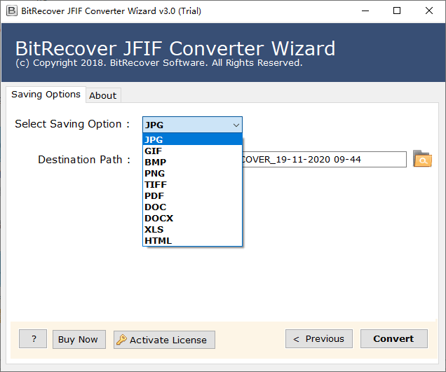 BitRecover JFIF Converter是一款便捷实用的JFIF图片转换工具,这款软件采用向导式的操作方法,可以快速的引导用户进行JFIF转换,软件支持转换的格式有数十种之多,其中除了常见的一些图片格式之外,您还可以将JFIF转换成PDF,DOC,DOCX,XLS等格式的文件;BitRecover JFIF Converter确实易于使用,尽管这款工具是全英文界面,用户也可以轻松上手,这款工具支持批量转换,可以将所有需要转换的图片添加到一个文件夹中,然后选择将该文件夹导入软件,选择需要转换的格式,一键即可高效的完成格式转换。
