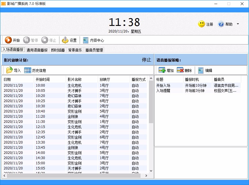 影院专用的语音播音软件,只需导入每天的影片放映时间表,即可进行全自动的语音播报