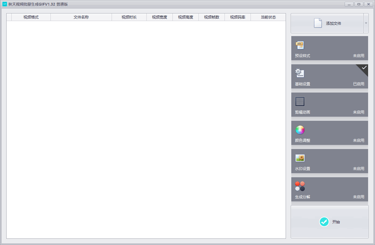 秋天视频批量生成GIF工具是一款GIF图像制作软件,该软件可以将视频的画面提取出来制作成GIF图像;软件比较灵活,可以满足用户制作GIF的各种需求,您可以使用旋转,裁剪以及添加水印等功能处理您的GIF图像;这款软件比平稳,对计算机的硬件需求也不是很高,通常一般的办公计算机和win7以上系统就可以平稳的打开并使用它制作GIF图像;秋天视频批量生成GIF工具相比较其它的GIF动图制作软件来说,界面会更加的简洁,功能也更为专业,如果您需要将视频制作成GIF图像的话,推荐您使用这款工具制作。