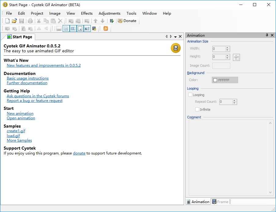 Cyotek Gif Animator是一款功能强大、简单易用的GIF图片制作软件,该软件而界面简洁友好、操作简单且功能全面,用户只需将图片添加到软件上即可进行GIF图片制作,该软件是专门用于GIF图片制作而研发,通过该软件用户可以将多张图片进行组合生成新的GIF动画图片;Cyotek Gif Animator还可以对多个静态图片进行简单编辑并组合生成GIF动态图片,同时还可以添加GIF图片文件到软件上进行二次编辑,该软件支持修改现有动画、提取帧,支持调色板编辑设置,让用户可以灵活的进行GIF图片制作和编辑,可以说是一款非常强大专业且方便实用的GIF动图制作编辑工具。