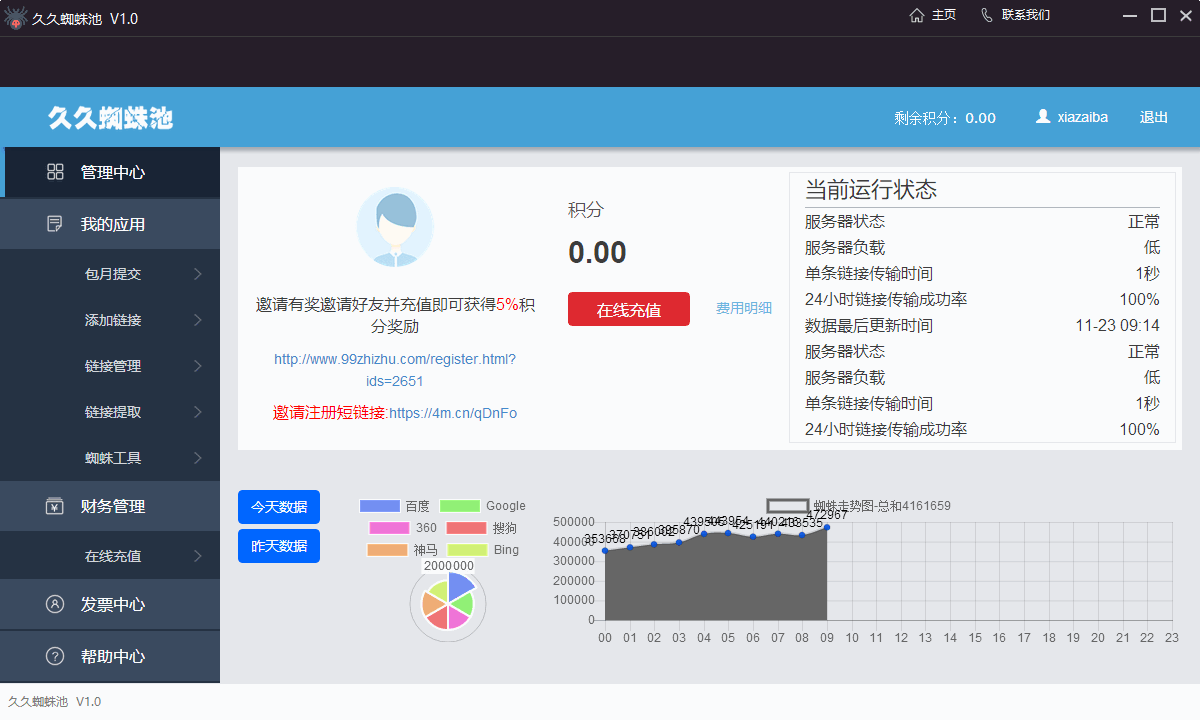 久久蜘蛛池是一款可以辅助网站站主运营网站的辅助工具,该工具可以理解成是一个圈养搜索蜘蛛的工具,它通过持续制作一些高质量页面来吸引蜘蛛爬取,就像是给蜘蛛喂食,将蜘蛛圈养在自己的网站中,从而实现用户网站页面的快速爬取,帮助用户提升网站的排名;该工具的使用方式非常简单,这得益于软件的用户界面简洁干净,并且针对部分比较迷糊的功能都有清晰的使用注释;久久蜘蛛池能够很好为您运营网站提供便利,价格直观,可提供发票,需要的朋友可以下载了解。