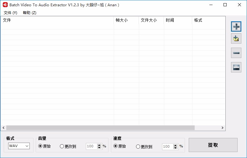 Batch视频音频提取器是一个可以批量从视频文件中提取音频的免费音频提取器,它提取出来的音频,可以保存为WAV, MP3, WMA, FLAC, AAC, AC3, MKA, M4A, OGG, etc等多达14种的音频格式,并且支持合并,即把提取的音频合并为一个文件,完成安装,打开 Batch Video To Audio Extractor 后,可将视频使用鼠标拖拽到界面空白处或按“+”来添加要提取的视频,并选择要提取的声音格式,在转换前,您可以选择要转换的格式,调整音量和速度等参数,总之这个软件,是个实用的视频音频提取器。