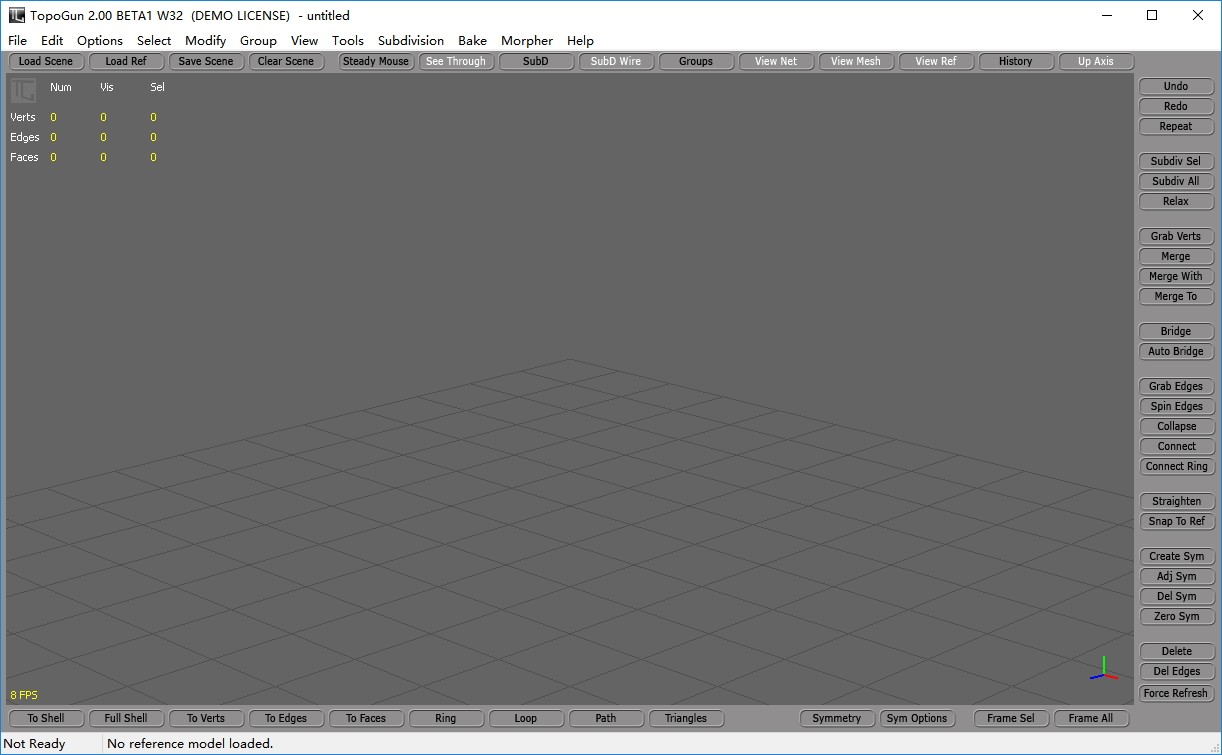 切换参考网格的线框渲染。但是,无论参考网格是否基于四边形,线框仅由三角形组成。TopoGun自动对参考网格进行三角化以提高渲染性能。