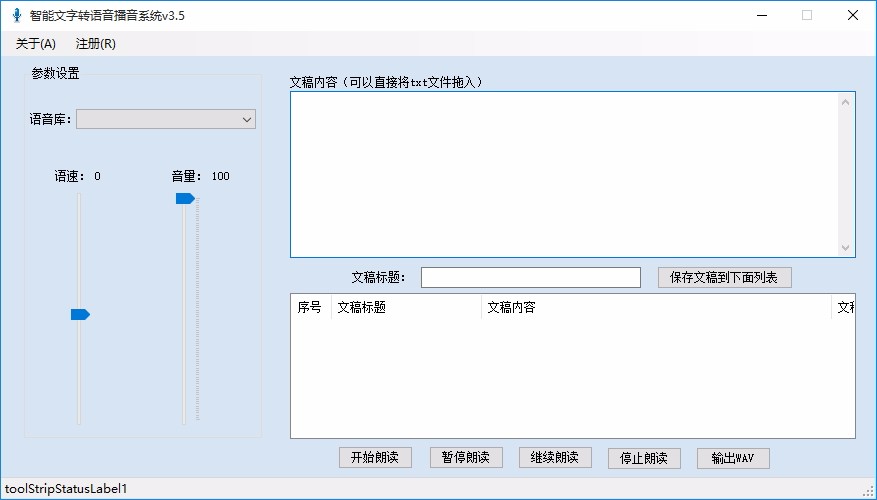 智能文字转语音播音系统是一款非常简单且实用的文字转语音软件,基于TTS技术,通过这款软件,可帮助用户快速将文字内容转换为语音文件,软件界面简洁直观,结构清晰明了,使得操作也变得非常简单,只需输入文稿内容,进行简单设置,即可快速进行朗读,将文稿内容转换为语音文件,通过相关精准的转换算法快速且准确的进行转换,即便您是新手,也能轻轻松松将文字转换为语音,并可进行播音,使用起来非常方便,总之这是一款非常好用的软件,如果您有需要,那就赶快下载体验一下吧!