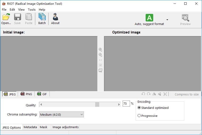 RIOT界面干净简洁、简单易用,是一款体积轻量、专业优秀的图像优化软件,该软件支持将图片的体积、质量优化功能,在不损失图片质量的情况下对图片体积进行优化压缩,减少图片体积对系统图片管理空间资源的占用,是一款非常不错的图片处理软件;使用RIOT这款图片优化软件,用户可以对图片体积控制到指定的大小,同时可以对图片亮度、对比度等参数进行设置,且该软件还支持对图片进行旋转翻转处理操作,让用户可以对添加到软件上的突破进行灵活处理编辑,方便用户对图片管理和后续的使用,特别适合优化体积过大的图片,可加快后续对图片的上传和分享速度。