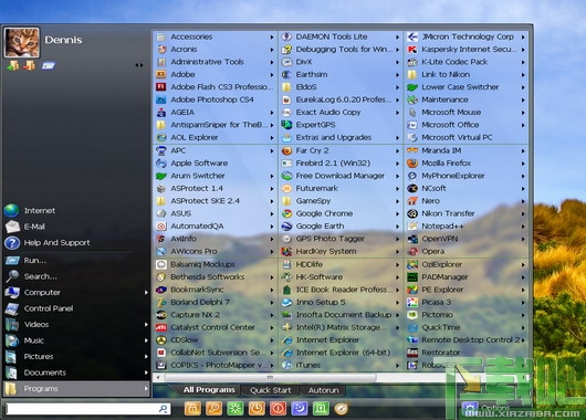 Vista Start Menu一个很好用的免费程序,用来更换已经存在了10年而不变风格的Windows XP系统开始菜单。如果你装的软件太多,可以试试这个与众不同的Vista Start Menu。它将开始菜单的程序组分成若干小组,以这种更为合理的方式让你快速找到你要启动的软件。如果不需要,你可以打开“开始菜单”的属性,随时恢复到以往的样子。