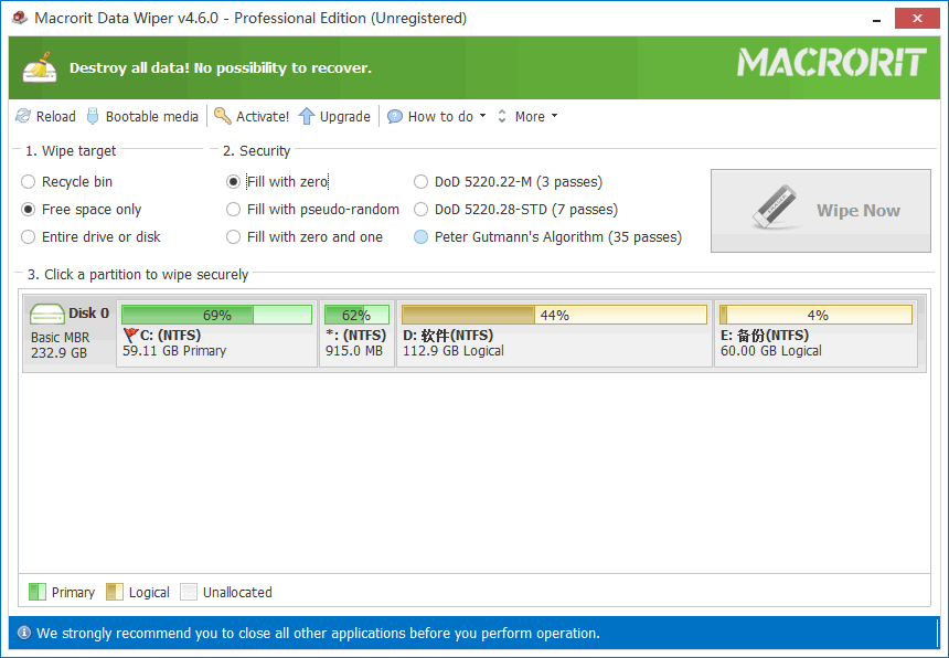 1、Macrorit Data Wiper可以帮助用户永久擦除整个磁盘或单独的分区。