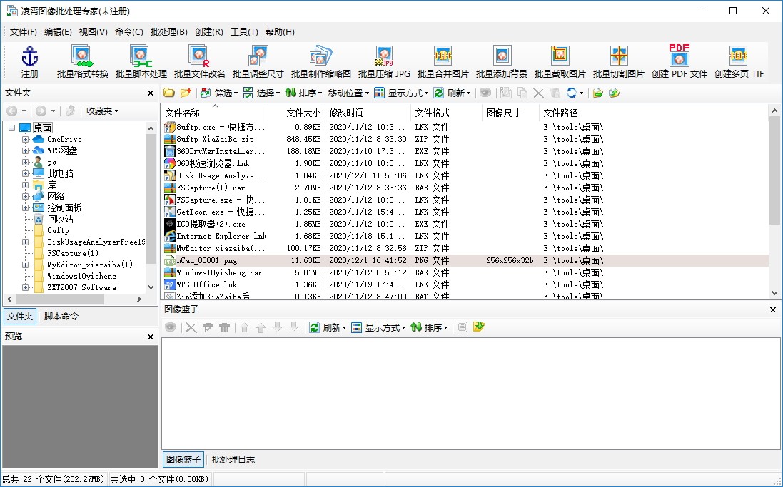凌霄图像批处理专家是一款专门针对图片处理而研发的软件,而该软件与其名字一样可以对图片进行批量处理,通过该软件用户可以点击选择软件上的任意图片格式对其进行处理,该软件内置有批量格式转换、批量脚本处理、批量文件改名、批量调整尺寸、批量制作缩略图、批量压缩JPG、批量合并图片、批量添加背景、批量截取图片、批量切割图片、创建PDF文件、创建多页TIF等多种功能,用户只需点击选择对应的功能即可弹出对应的图片处理引导弹框,用户只需根据软件操作向导即可对图片进行各种处理操作,即使是图片处理小白或者新手都可快速上手使用该软件进行快速高效的批量处理。